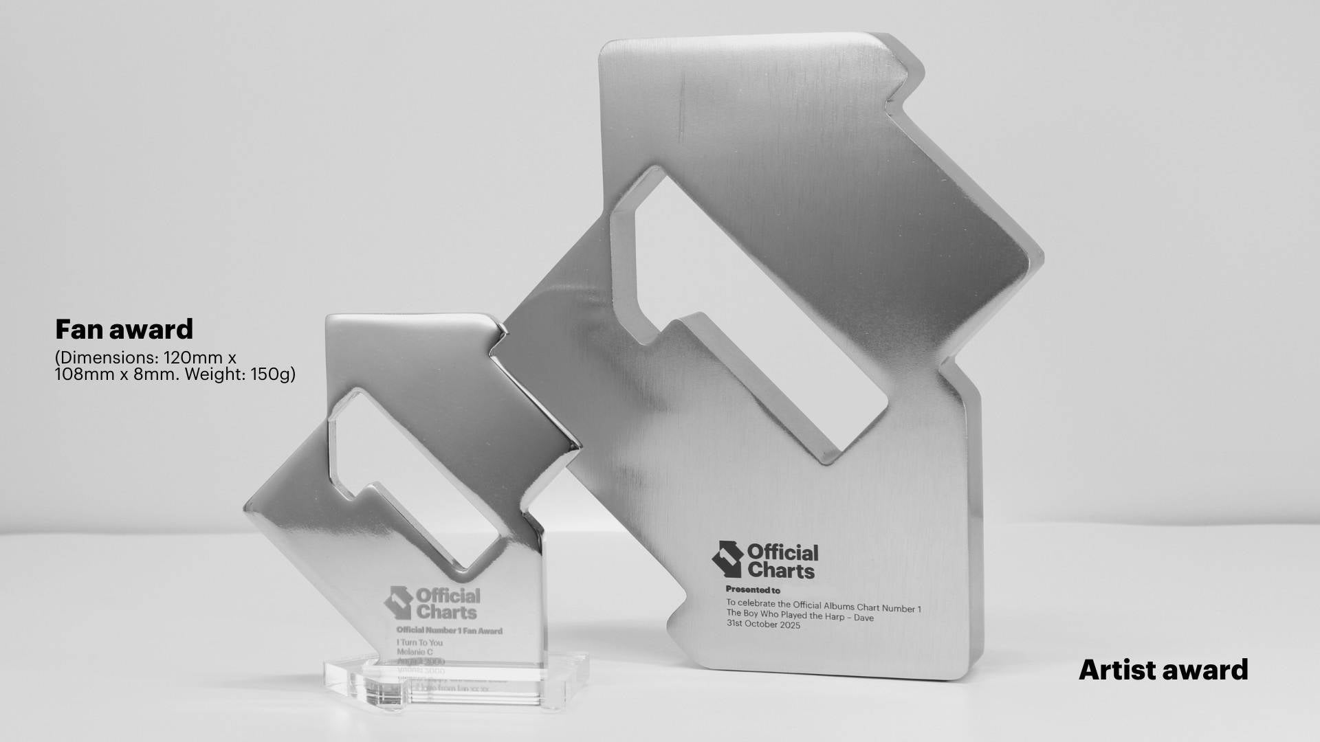 The Fan Award is small & perfectly formed (measuring 120mm x 108mm x 8mm and weighing 150g) – and you can select the title of your choice from this list of 2023's chart-topping hits: